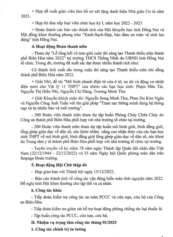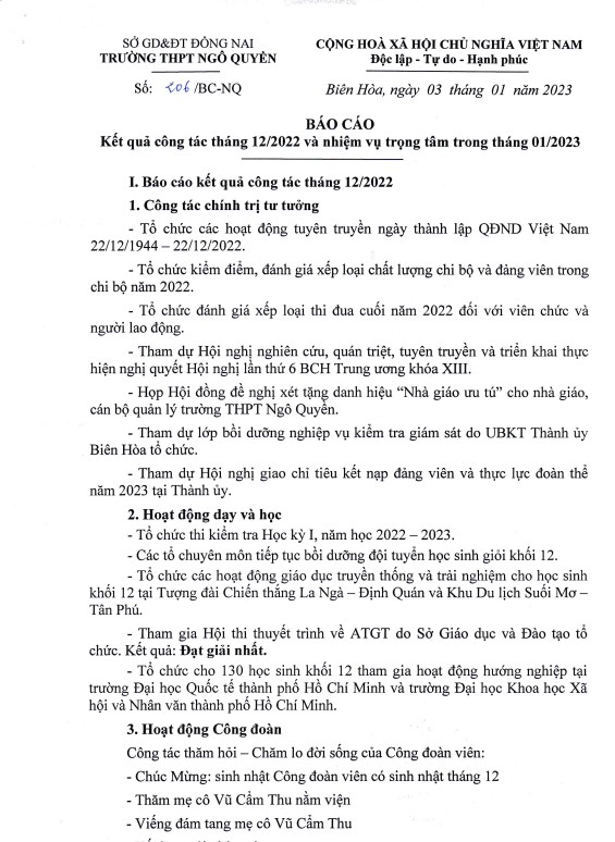BÁO CÁO KẾT QUẢ CÔNG TÁC THÁNG 12/2022