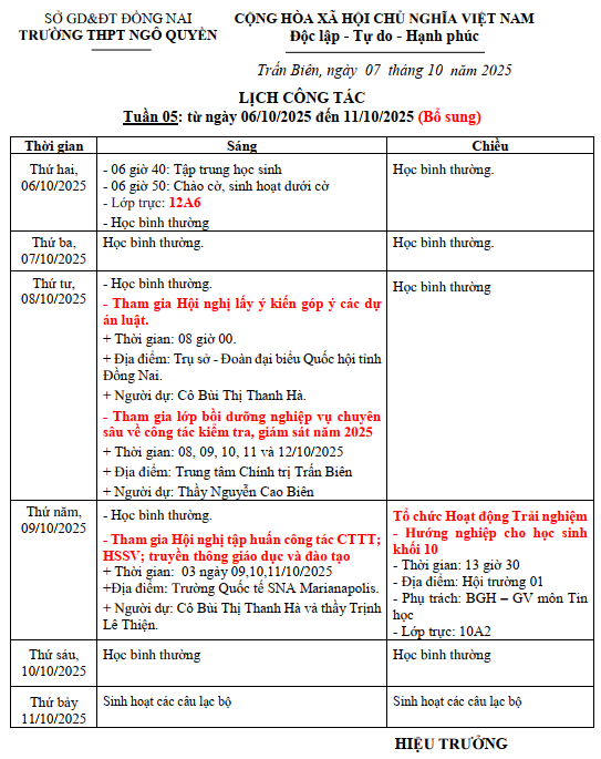 LỊCH CÔNG TÁC TUẦN 05 - ÁP DỤNG TỪ NGÀY 06/10/2025 ĐẾN NGÀY 11/10/2025