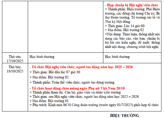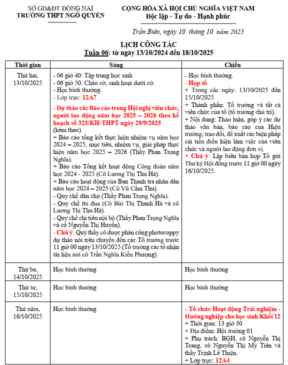 LỊCH CÔNG TÁC TUẦN 06 - ÁP DỤNG TỪ NGÀY 13/10/2025 ĐẾN NGÀY 18/10/2025