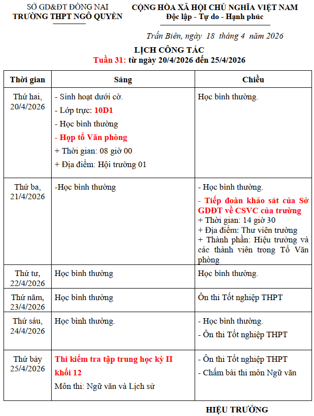 LỊCH CÔNG TÁC TUẦN 31 - ÁP DỤNG TỪ NGÀY 20/04/2026 ĐẾN NGÀY 26/04/2026