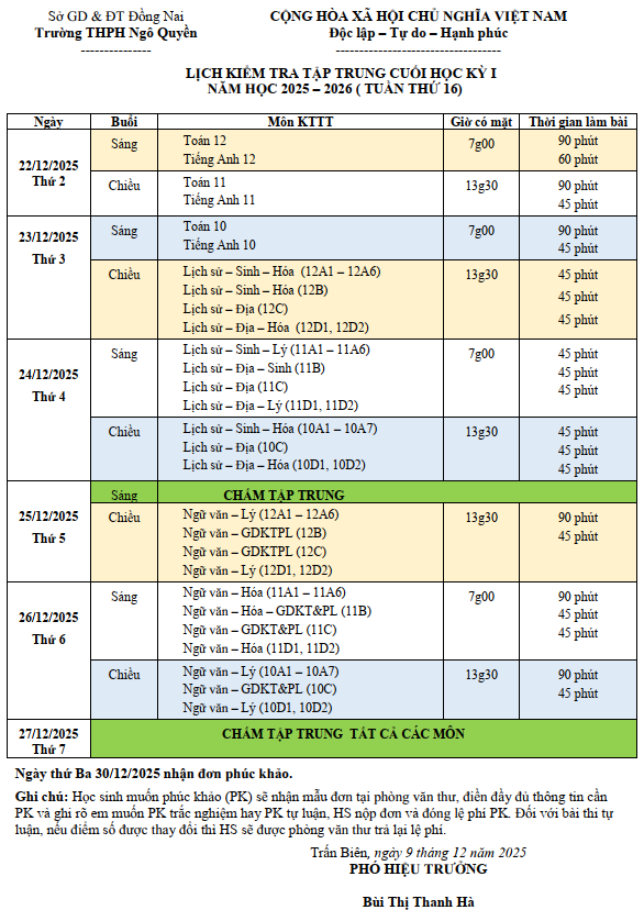 LỊCH THI CUỐI HỌC KỲ I - NĂM HỌC 2025 - 2026