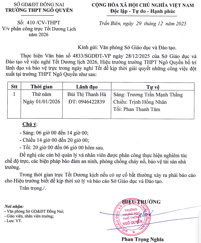 LỊCH NGHỈ TẾT DƯƠNG LỊCH NĂM 2026 VÀ LỊCH TRỰC CỦA BAN GIÁM HIỆU