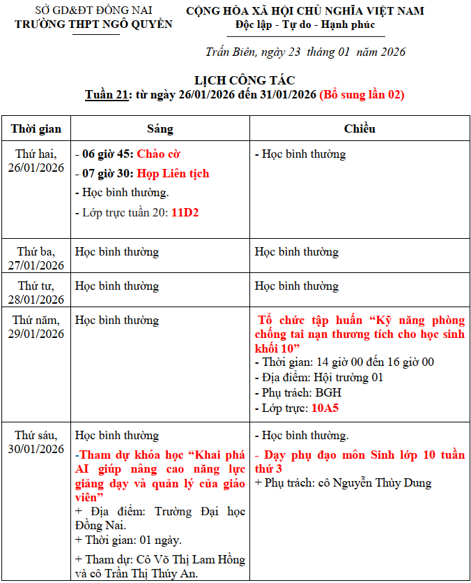 LỊCH CÔNG TÁC TUẦN 21 - ÁP DỤNG TỪ NGÀY 26/01/2026 ĐẾN NGÀY 31/01/2026