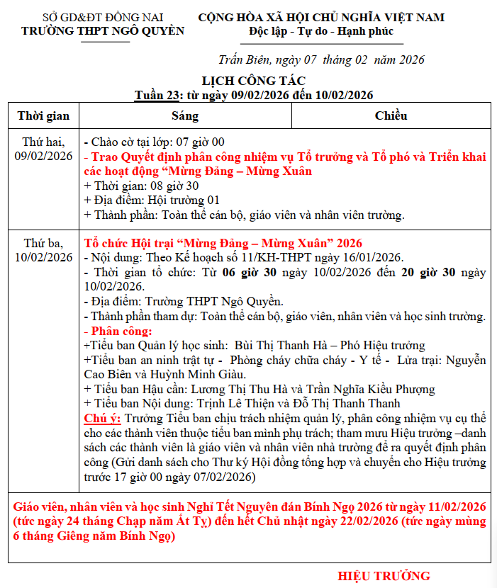 LỊCH CÔNG TÁC TUẦN 23 - ÁP DỤNG TỪ NGÀY 09/02/2026 ĐẾN NGÀY 10/02/2026
