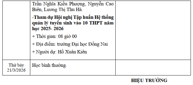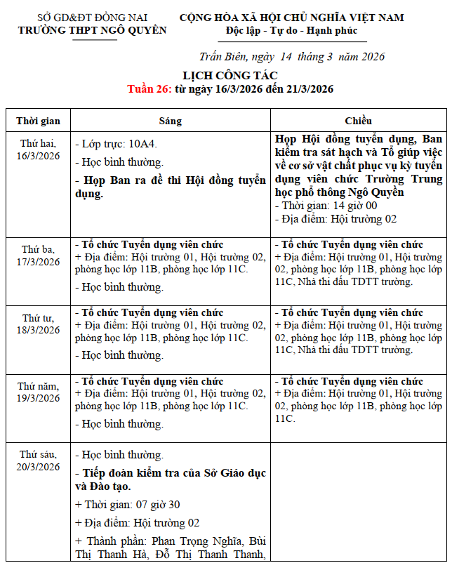 LỊCH CÔNG TÁC TUẦN 26 - ÁP DỤNG TỪ NGÀY 16/03/2026 ĐẾN NGÀY 22/03/2026