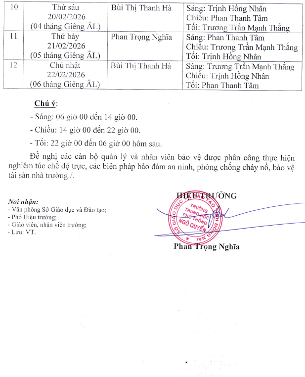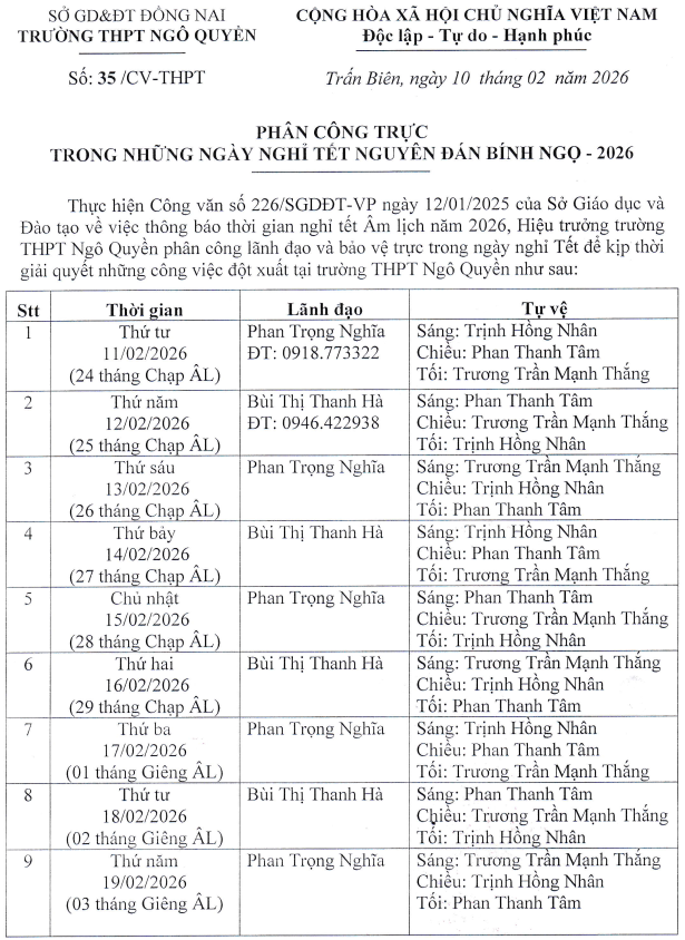 LỊCH PHÂN CÔNG TRỰC TẾT NGUYÊN ĐÁN BÍNH NGỌ 2026