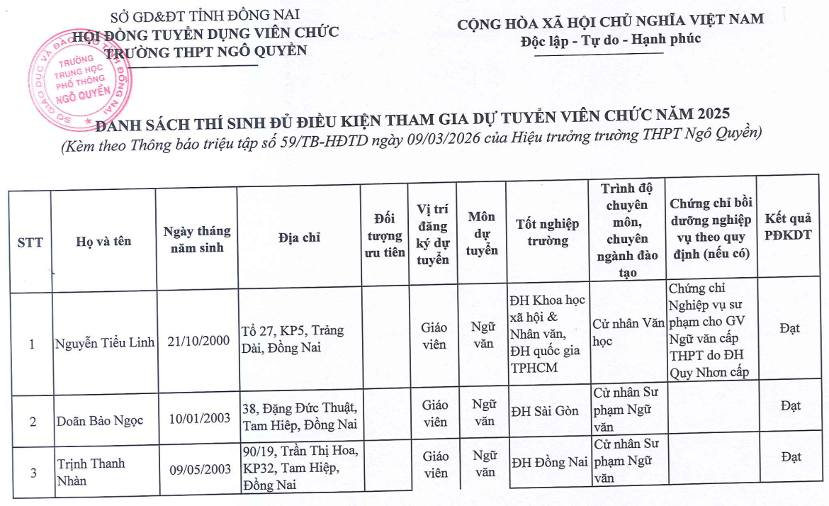 THÔNG BÁO TRIỆU TẬP VÀ DANH SÁCH CÁC THÍ SINH ĐỦ ĐIỀU KIỆN DỰ TUYỂN VIÊN CHỨC TRƯỜNG THPT NGÔ QUYỀN NĂM 2025